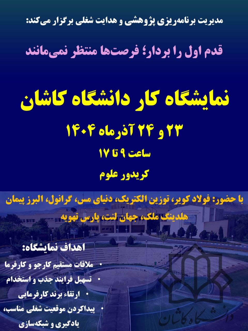 شایان ذکر است که اولین نمایشگاه کار در دانشگاه کاشان در تاریخهای 23 و 24 آذرماه 1404، با برنامهریزی مناسب، مشارکت فعال شرکتها و استقبال گسترده دانشجویان، به یکی از رویدادهای موفق دانشگاه در حوزه هدایت شغلی تبدیل شد.