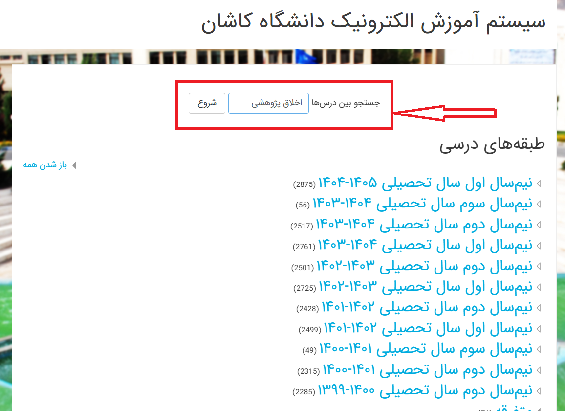 به منظور شرکت در آزمون، ابتدا با شناسه کاربری و رمز ورود خود وارد سامانه LMS شوید و سپس مانند شکل زیر درس اخلاق پژوهشی را جستجو کنید: